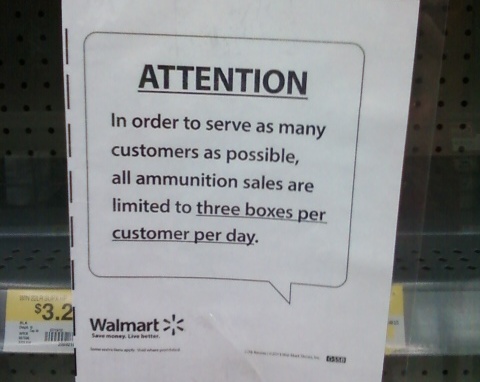 Wal-Mart has instituted a chain-wide 3 boxes of ammo per day limit in their stores.