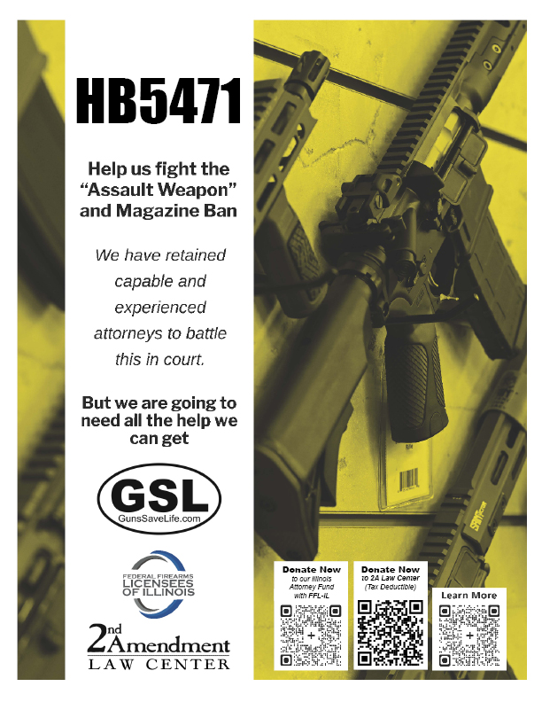 We’ve retained two legal teams here in the Land of Lincoln already to handle the coming lawsuits (plural). To help fund our local counsel, our coalition has agreed to steer everyone to the FFL-IL organization’s legal defense fund. It’s not perfect, but time is of the essence ad the FFL-IL’s leadership, including its head Dan Eldridge of Maxon’s, assures us that all donations will be exclusively earmarked for our Illinois legal fight. I TRUST DAN ELDRIDGE on this, and you should too. This one is not tax deductible.